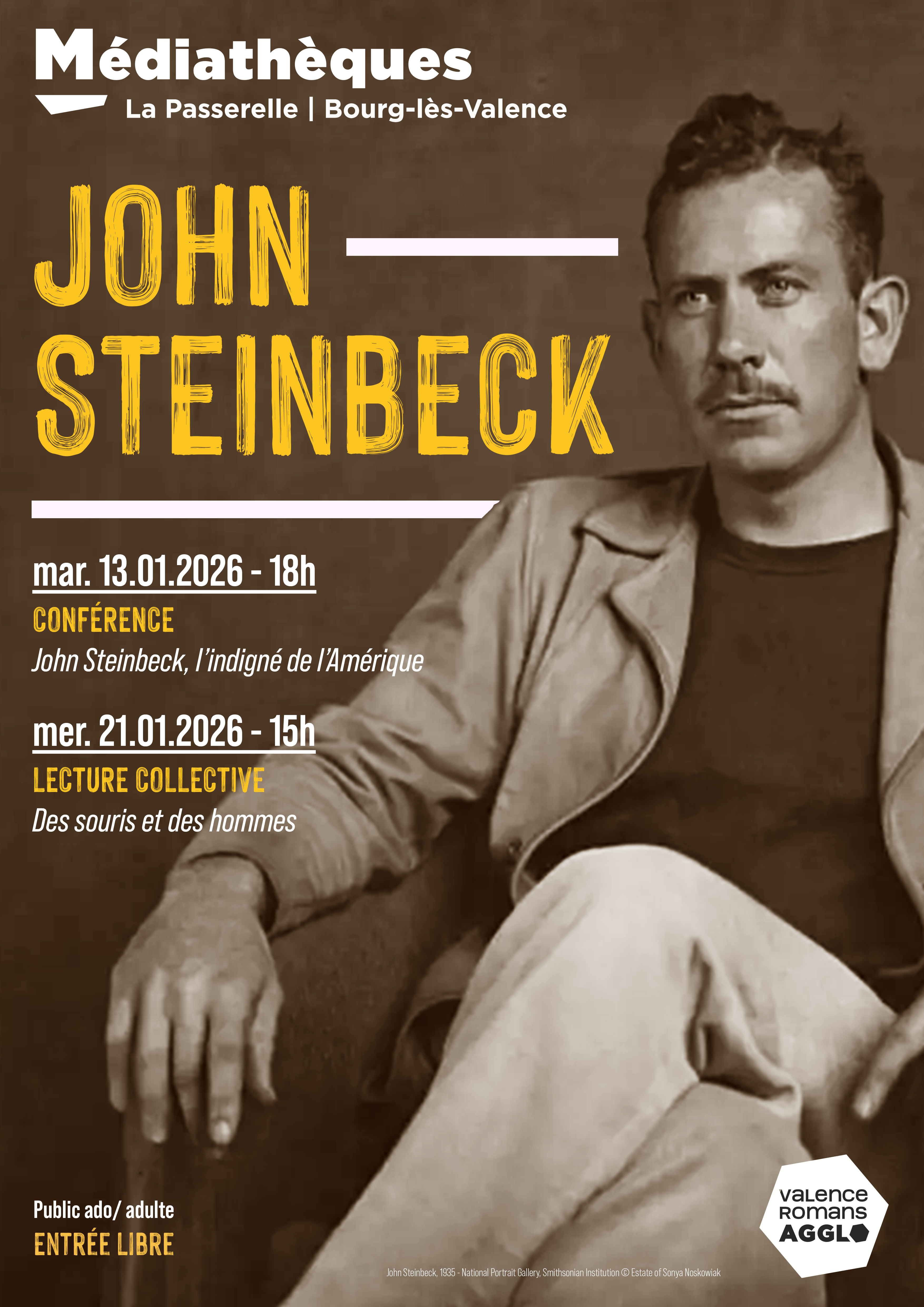 Mardi 13 janvier (18 h) : Conférence « John Steinbeck, l’indigné de l’Amérique » par Laurence Creton, professeure au Lycée des 3 Sources, Docteure en Littératures comparées.