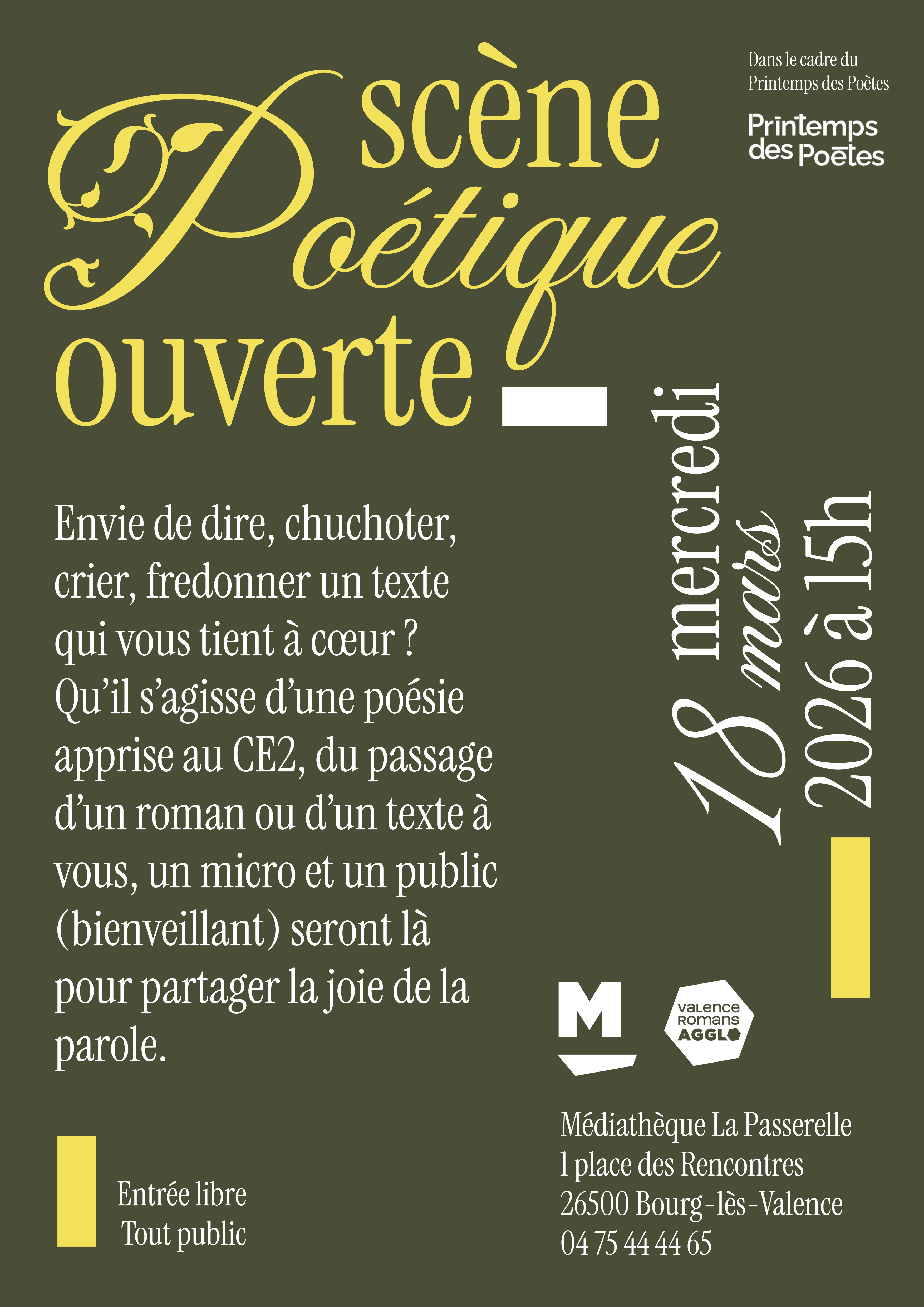 Envie de dire, chuchoter, crier, fredonner un texte qui vous tient à cœur ? Qu’il s’agisse d’une poésie apprise au CE2, du passage d’un roman ou d’un texte à vous, un micro et un public (bienveillant) seront là pour partager la joie de la parole. (Dans le cadre du printemps des poètes)