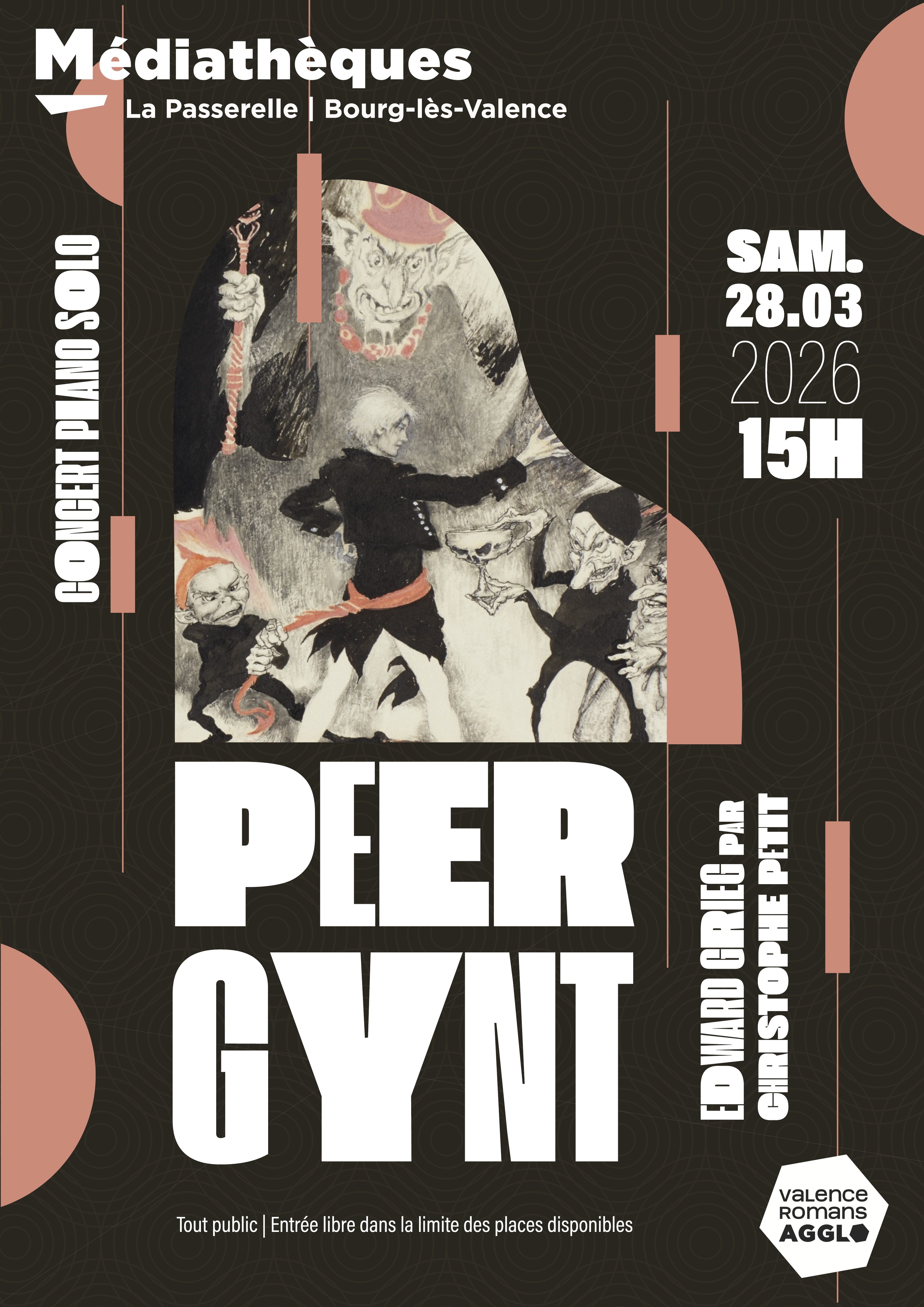 Peer Gynt est une des suites symphoniques les plus connues du répertoire classique. L’immense succès de ces mélodies décidera son compositeur, le norvégien Edvard Grieg, à en faire des transcriptions pour piano seul. Christophe Petit, talentueux pianiste de Valence vous propose un concert de ces transcriptions, accompagné de lectures du texte d’Henrick Ibsen et d’éléments de contexte pour cette œuvre universelle.