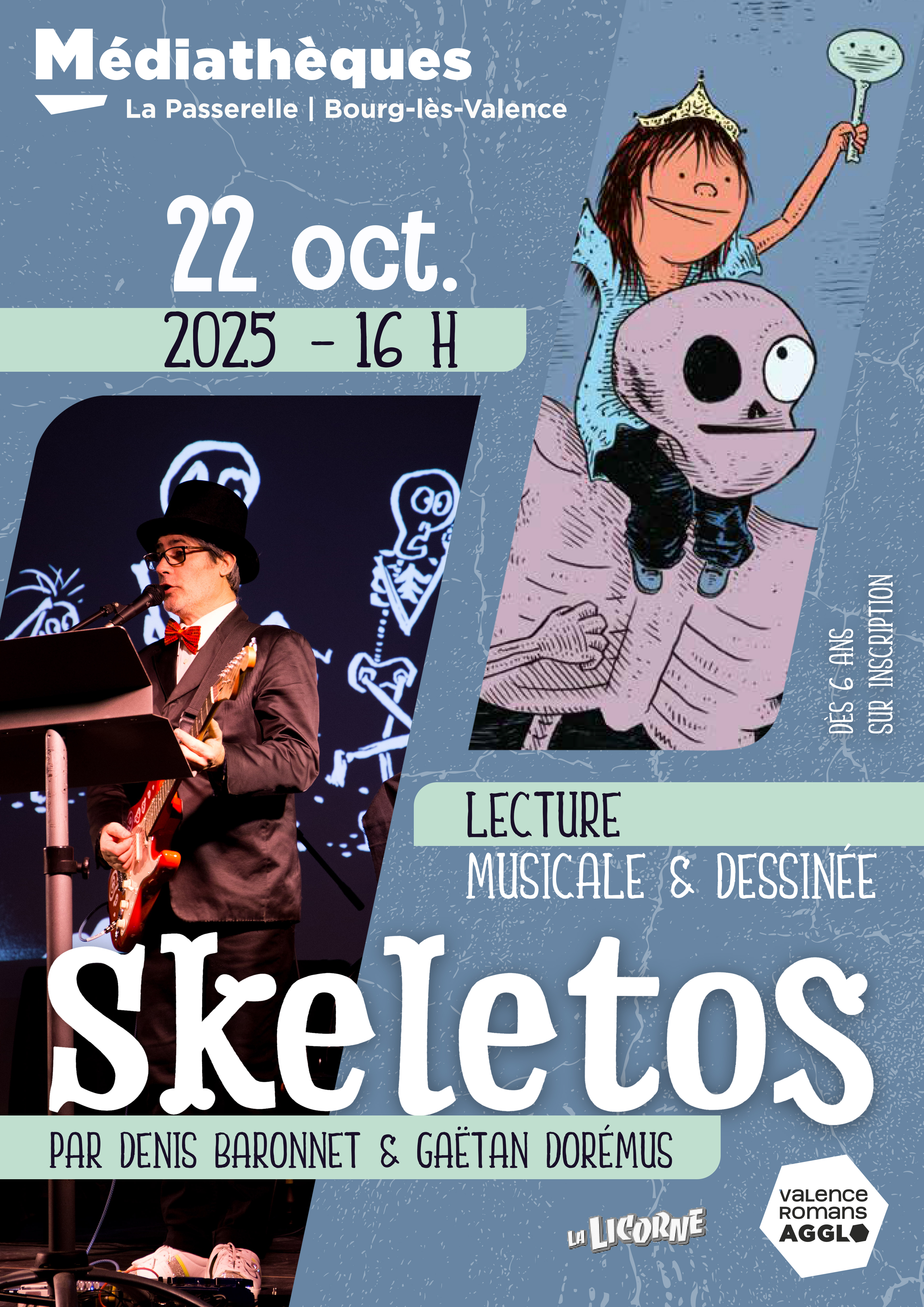 Mercredi 22 octobre (16 h) : Spectacle « Skeletos : lecture musicale et dessinée à mourir de rire » (45 min, à partir de 6 ans, sur réservation à partir du 23 septembre)