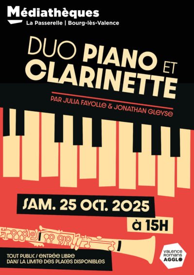 Samedi 25 octobre (15 h) : Concert duo piano/clarinette avec Julia Fayolle, piano et Jonathan Gleize, clarinette (tout public, entrée libre dans la limite des places disponibles)
