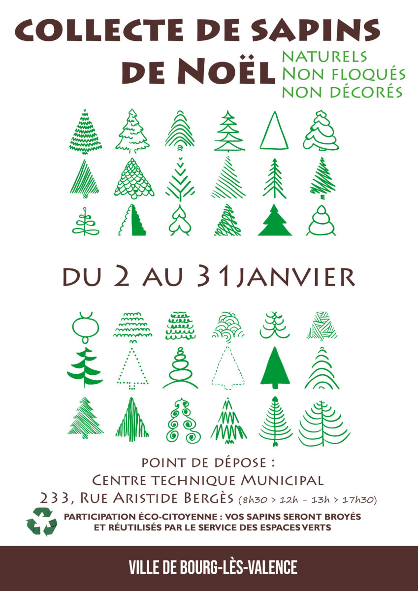 Pour cette raison, que la mairie de Bourg-lès-Valence met à disposition un point de collecte spécifique pour les sapins de Noël*. Il suffit de se rendre au Centre Technique Municipal du 2 au 31 janvier de 8h30 > 12 et de 13h à 17h30 avec son sapin* et de le déposer dans les containers prévus à cet effet.