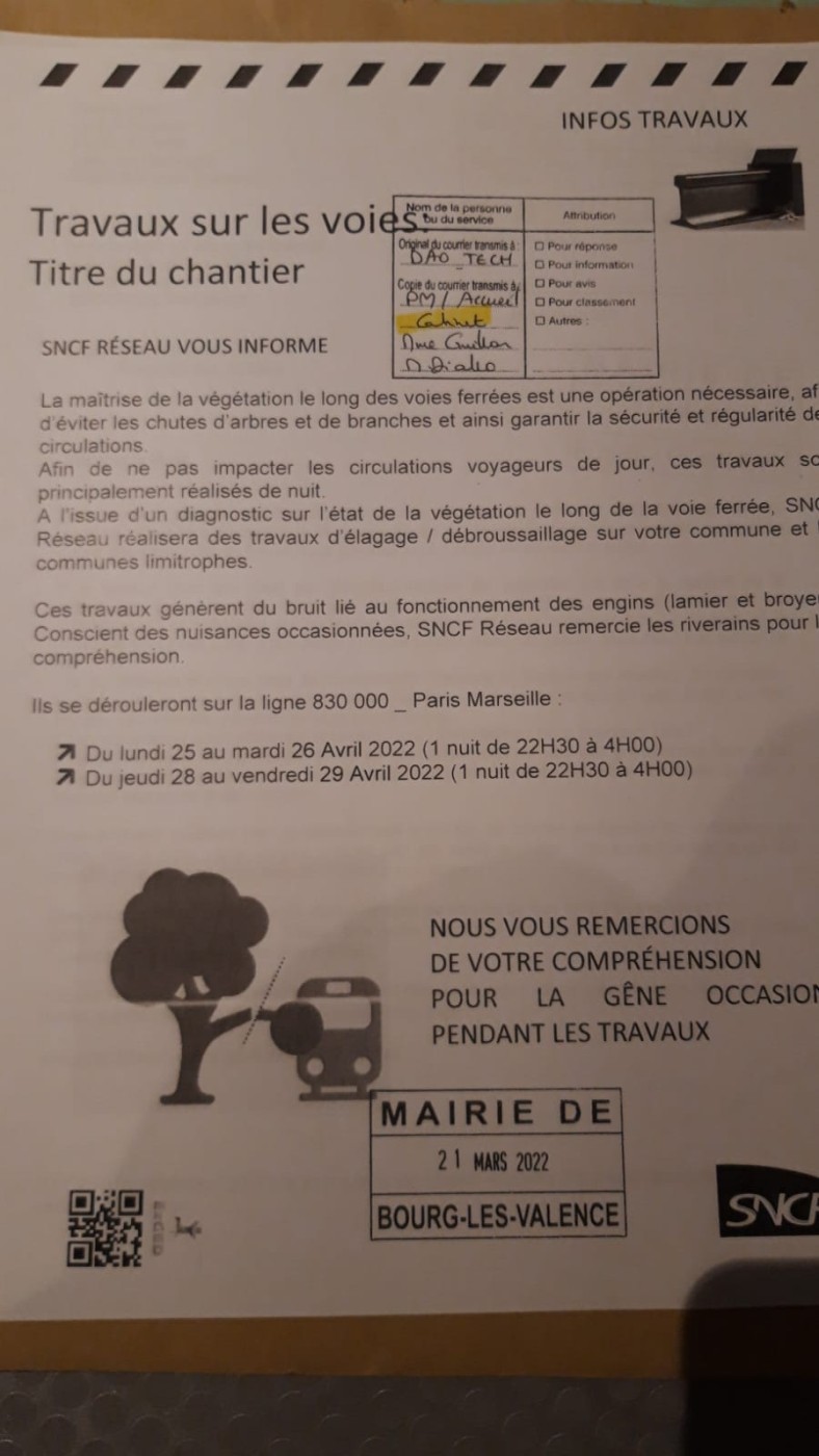 La SNCF nous informe que des travaux de nuit sur les voies traversant Bourg-lès-Valence auront lieu de 22h 45 à 5h00 du matin